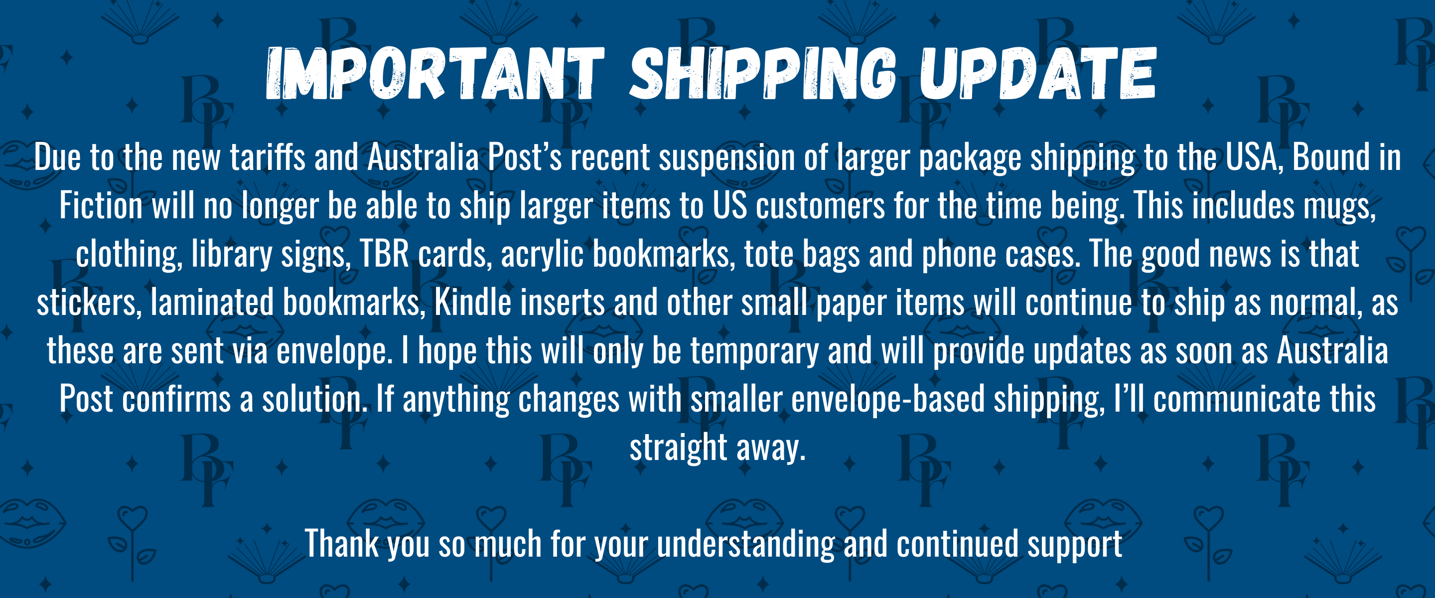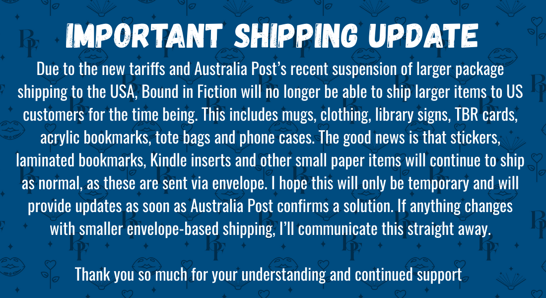 Located in Sydney, Australia, we are focused on providing the best bookish merchandise to readers around the world. We specialise in the romance genre (both sweet and spicy), and we hope you find something here to complement your love of reading.